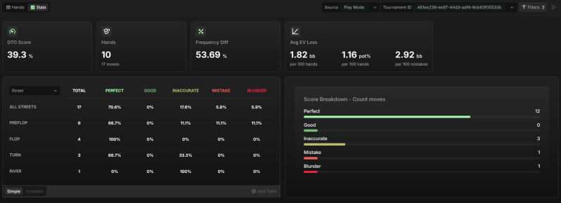 There is also a feature where, after the match, GTO Wizard gives you insight into your match, allowing you to see how well you played and analyse your game.