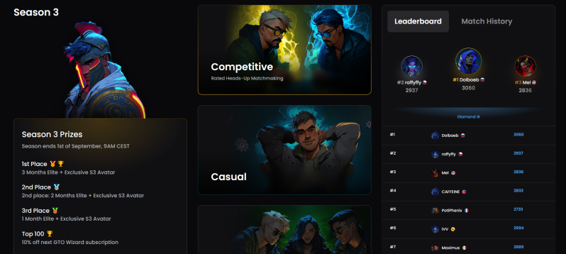 The prizes for this season are: 1st place - 3 Months of Elite GTO Wizard subscription + Exclusive S3 Avatar for your Poker Arena profile, 2nd place gives 2 Months of Elite GTO Wizard subscription + Avatar, and 3rd place gives one Month of Elite GTO Wizard subscription + Avatar. The top 100 places will also earn a 10% discount on their next GTO Wizard purchase.