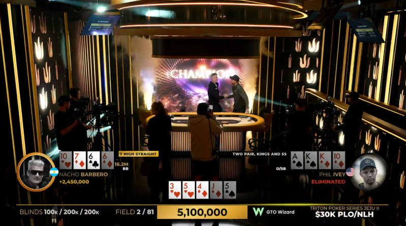 The game was PLO, and Ivey opened with AsKsKdTd, and Barbero called with Th7d6c6d. The flop came 3h5h4d giving Barbero flopped straight, both players checked. The turn was Jd, bringing a flush draw to Ivey. Barbero led, and Ivey shoved just to get snap-called by Barbero.